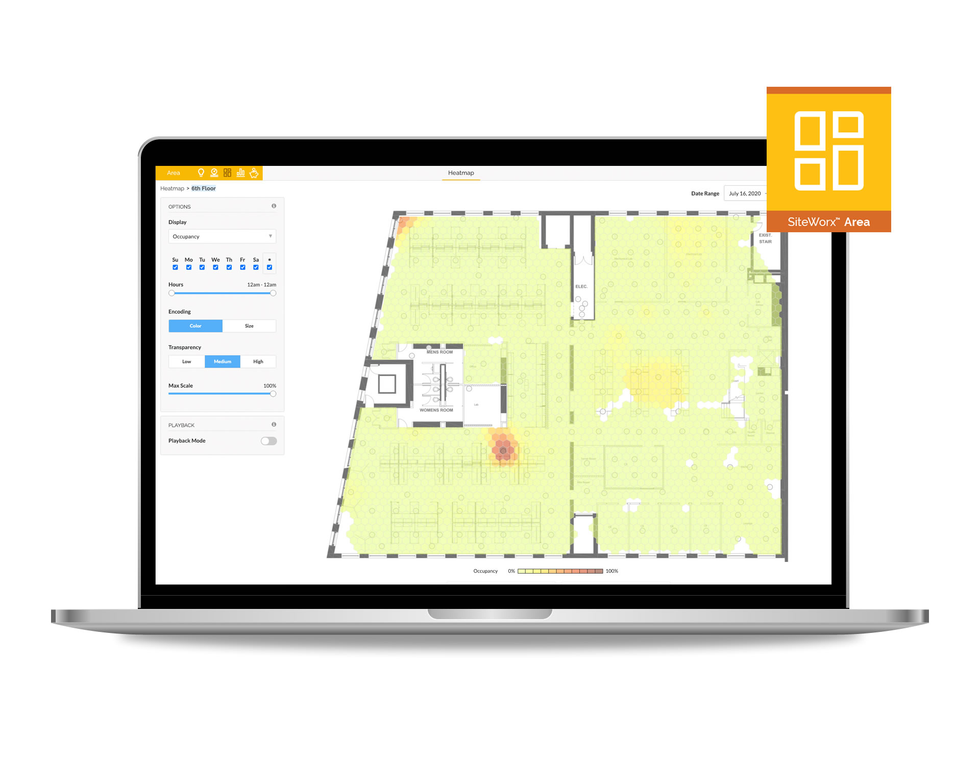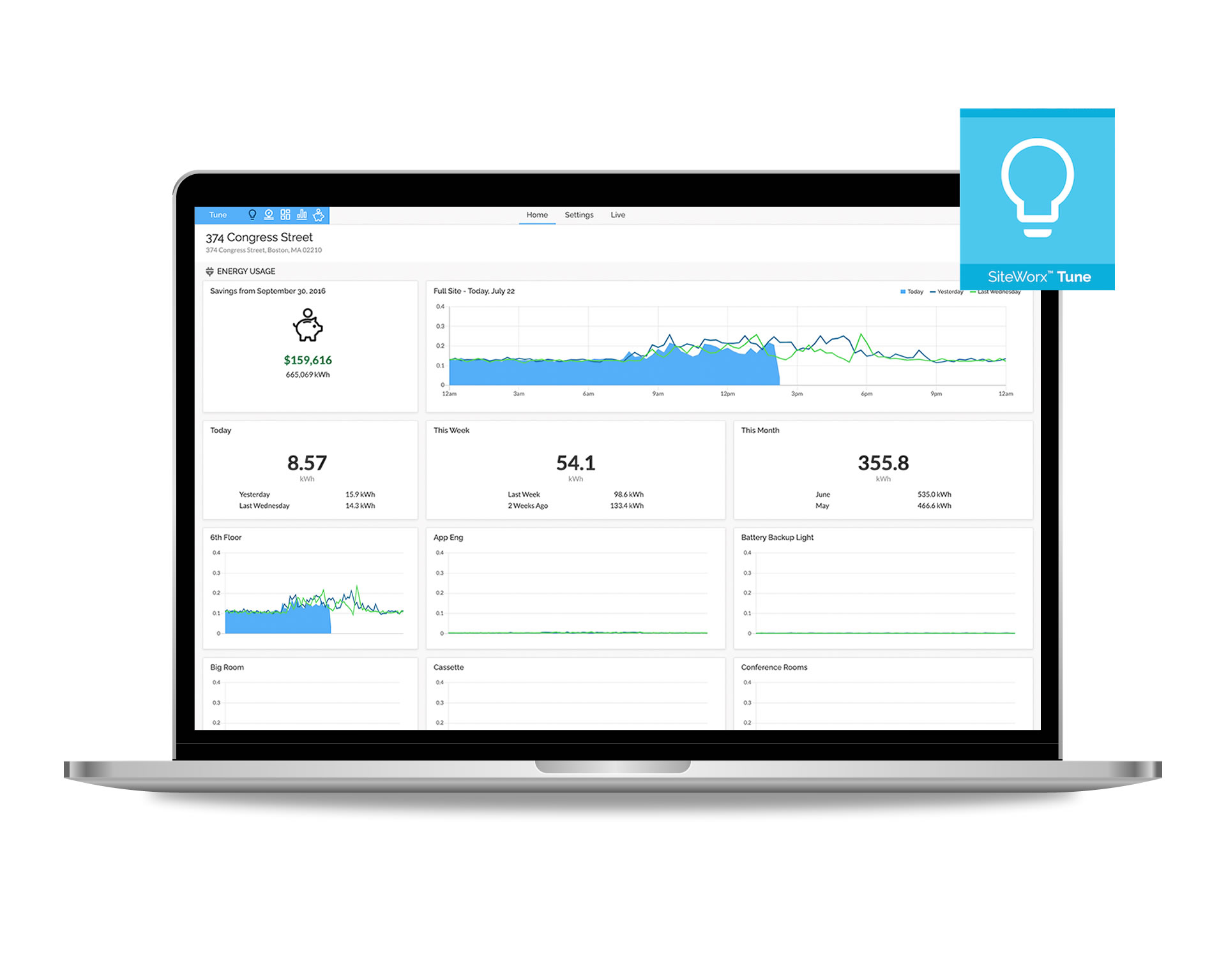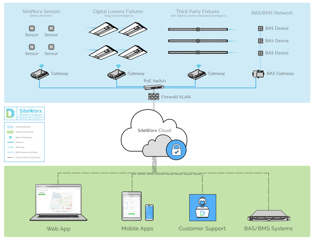 Az Iot érzékelők által továbbított adatokból a felhőalapú alkalmazás a távoli felügyelet mellett, valós megtérülést biztosító, fejlett elemzéseket és alkalmazható jelentéseket készít. Ezen felül, a SiteWorx lehetővé teszi a világítás és más szenzor-alapú bemenetek távvezérlését, ezáltal biztosítva a létesítmény zavartalan és hatékony működését.